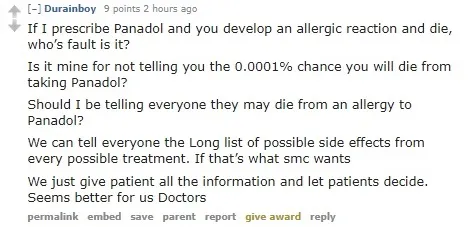Woah woah woah. Now this is not correct. There is no need to tell patients that there is a 0.0001% chance of dying from taking Panadol, because a very severe consequence may not need to be disclosed if its chances of occurring are so low that the possibility is not worth thinking about. Check out my previous post on this. [Link]
