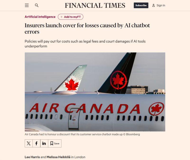 The Financial Times reports that insurers at Lloyd's of London have launched a product to cover losses caused by malfunctioning AI tools.¹
