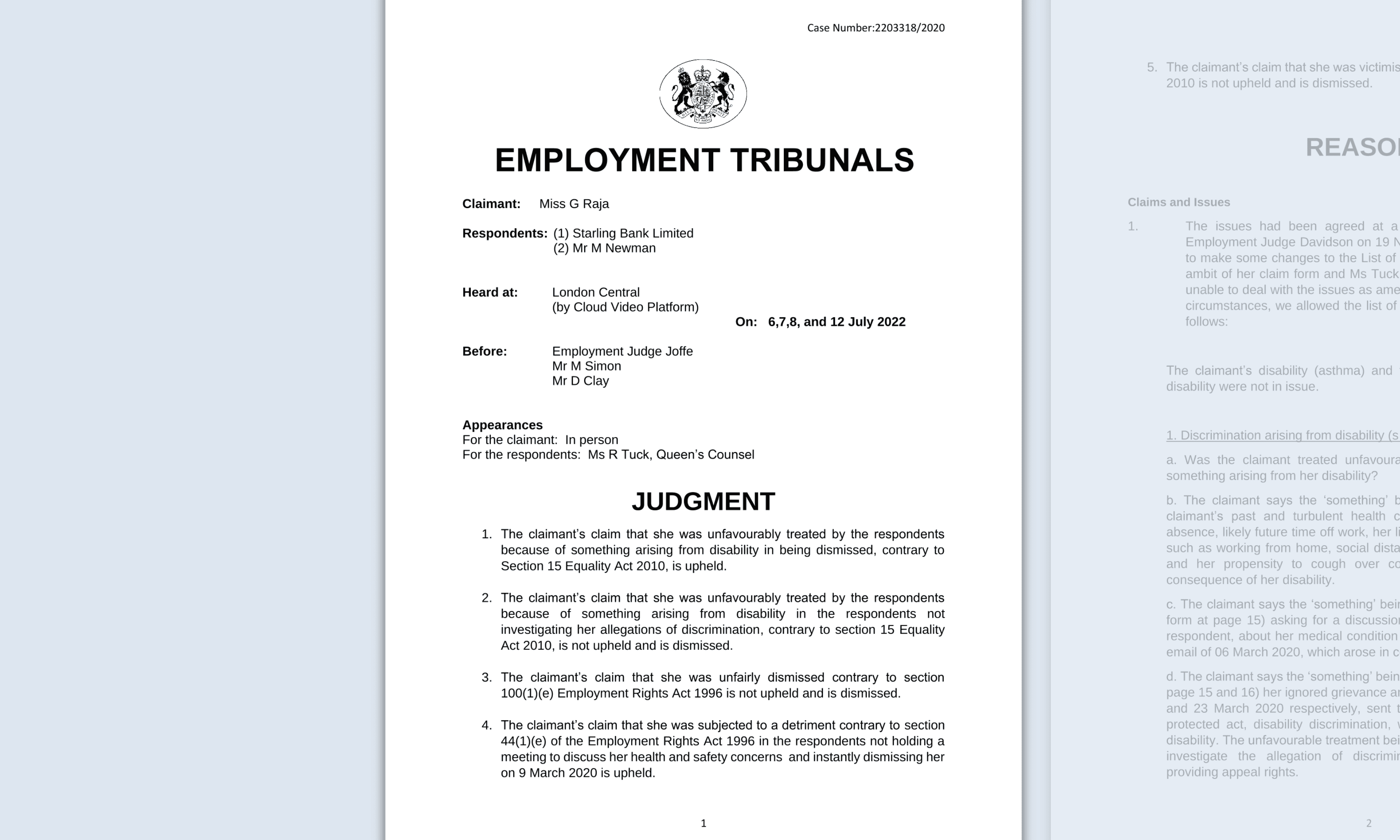 GR claimed that she had been wrongfully dismissed because of her health issues. The UK Employment Tribunal agreed that she had been unfairly treated because of her disability.