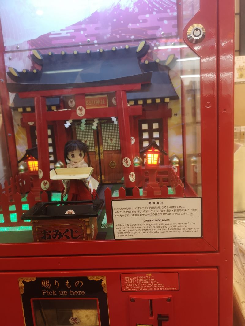 ¹¹ This is a fortune-telling vending machine. The disclaimer reads: "All the contents written and suggested on the papers you draw are for the purpose of entertainment and not backed up by scientific evidence. They don't guarantee to improve your luck even if you follow the suggestions. Please note that you and we shall not be responsible for any troubles caused by your actions."