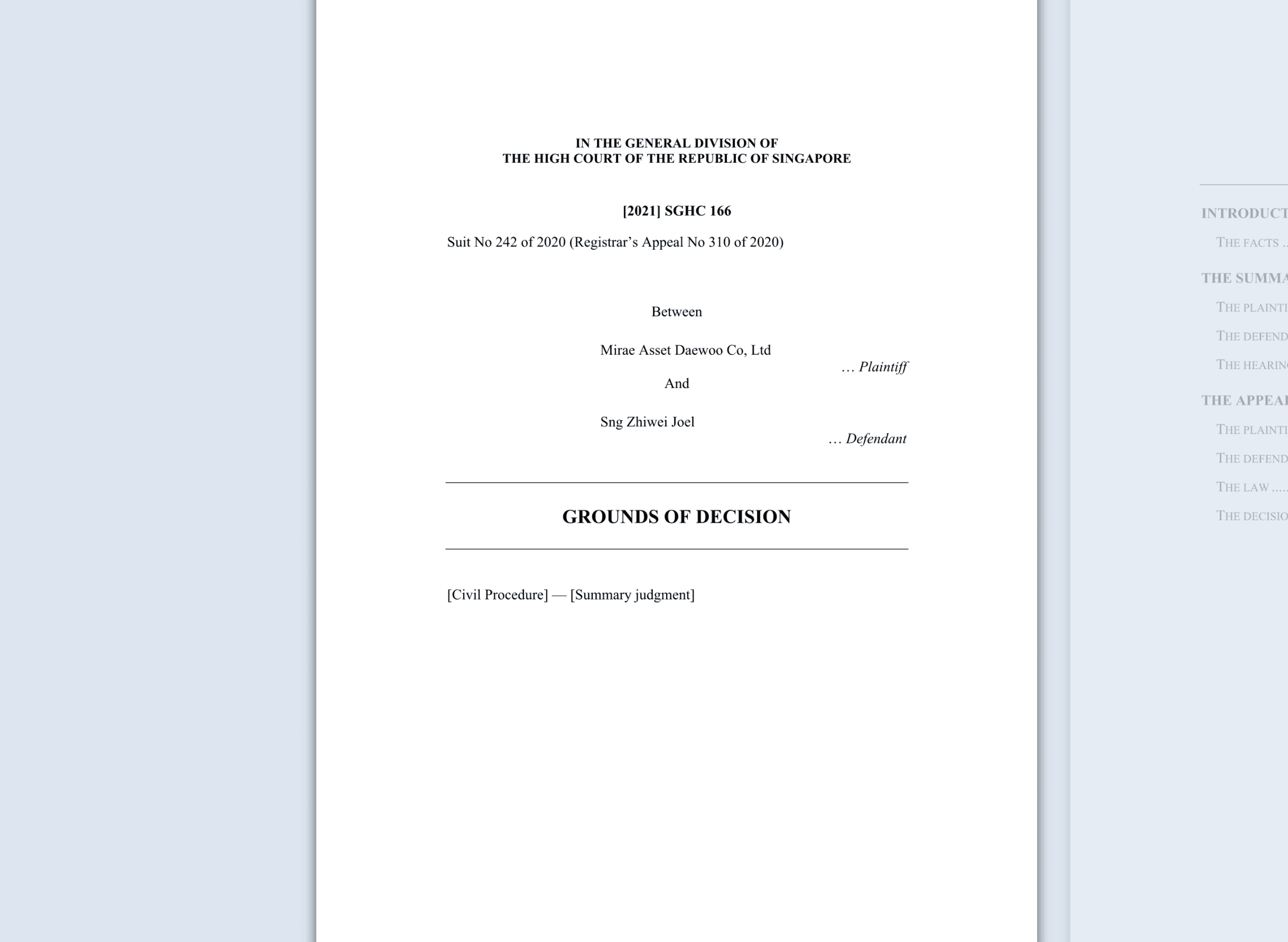 HF sued Sng, and applied for summary judgment.¹ Sng (naturally) resisted the application for summary judgment. Sng succeeded before an Assistant Registrar, but HF appealed. The High Court Judge who heard the appeal granted final judgment in favour of HF.²