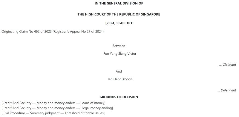 The matter was first heard by an Assistant Registrar, who held that the presumption that VF was a "moneylender" did not arise, and granted VF summary judgment.